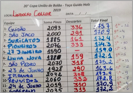A fase classificatória da Copa Chimia de 2019, foi encerrada com o jogo em Lindolfo Collor, que teve a vitória da equipe da casa, o Grupo de Bolão Guidão, com 1.757 pinos. Com a soma de 1.752 pinos, o Grupo São Pedro de Ivoti ficou com a segunda posição. Em terceiro lugar tivemos o Grupo Pioneiros, de Picada Café, que derrubou 1.743 pinos.